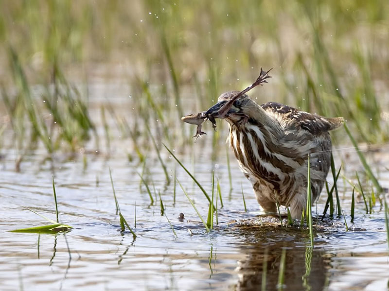 American BitternThe American Bittern eats small fish, eels, small snakes, salamanders, insects, frogs, crayfish, and small mammals. It stands still in the water and waits for its prey. When it spots something, it quickly goes after it and catches it in its bill. It then swallows its catch whole!