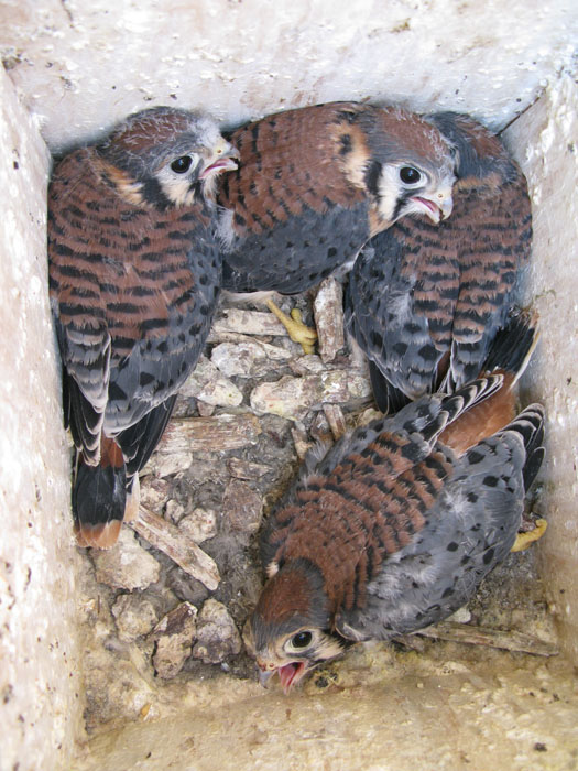 American KestrelThe American kestrel can be found in almost any habitat that has open areas for hunting and tall places for it to perch. The American kestrel is the only North American falcon or hawk that nests in cavities. It makes its nest in tree cavities, under eaves, in woodpecker holes and in nesting boxes.