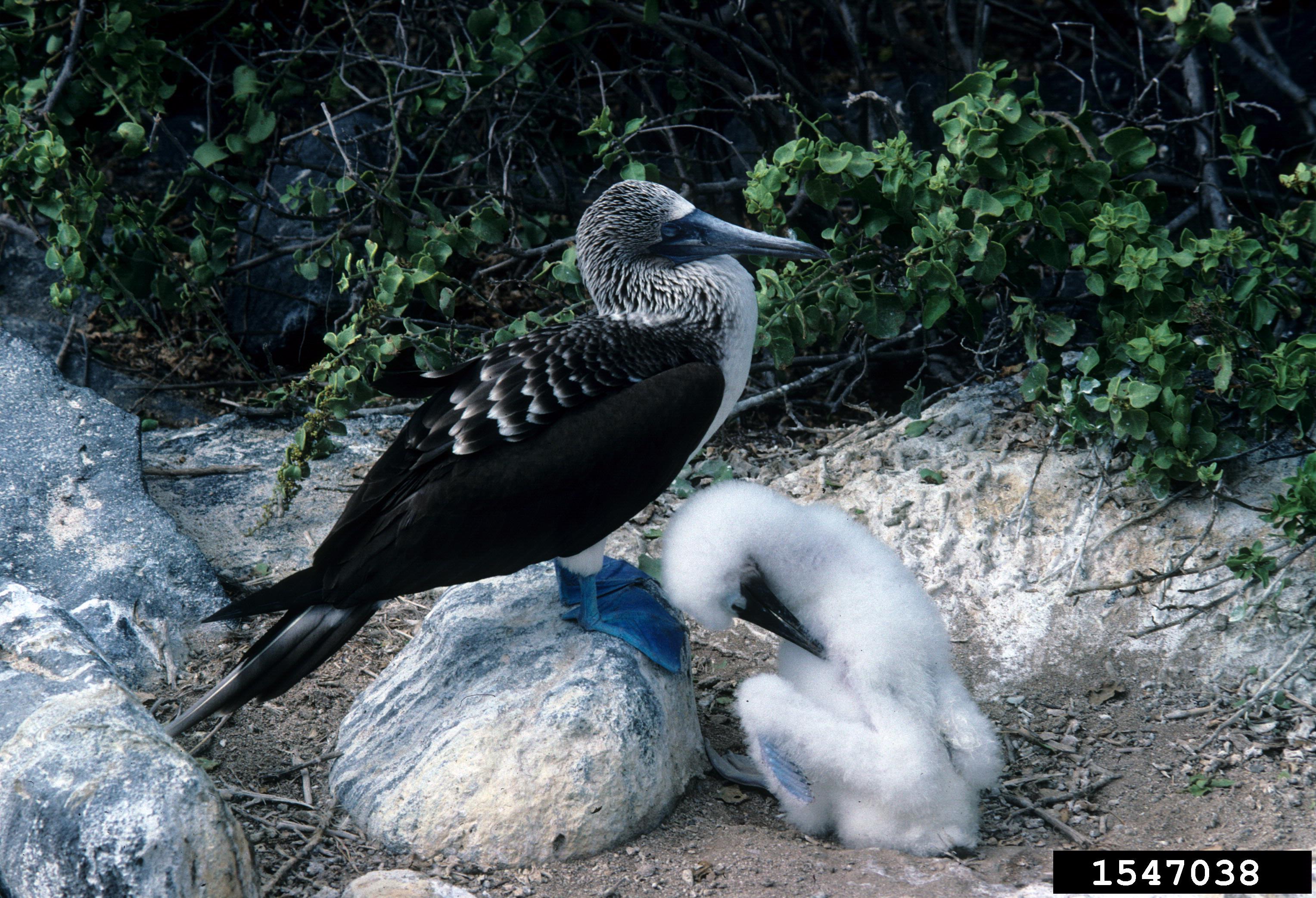 Blue-footedThe male brings food back to the nest for the female and the chicks. The chicks take regurgitated fish from their parents' bills. The chicks stay with their parents for about two months. The blue-footed booby nests in colonies.