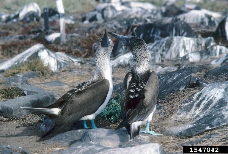 Blue-footedBlue-footed boobies have a very elaborate mating ritual. The male raises one blue foot in the air and then the other as he struts in front of the female. Both the male and the female stretch their necks and point their bills to the sky. The male spreads his wings and whistles. The female may tuck her head under her wing.