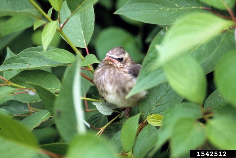 Cedar WaxwingThe female cedar waxwing lays four to six eggs. She will incubate the eggs for about 12 days. The male will bring her food and guard the nest while she incubates the eggs. The chicks are born blind and naked. Both parents feed the chicks. The chicks fledge in about two weeks. Both parents will continue to feed them for 6-10 days after they fledge.