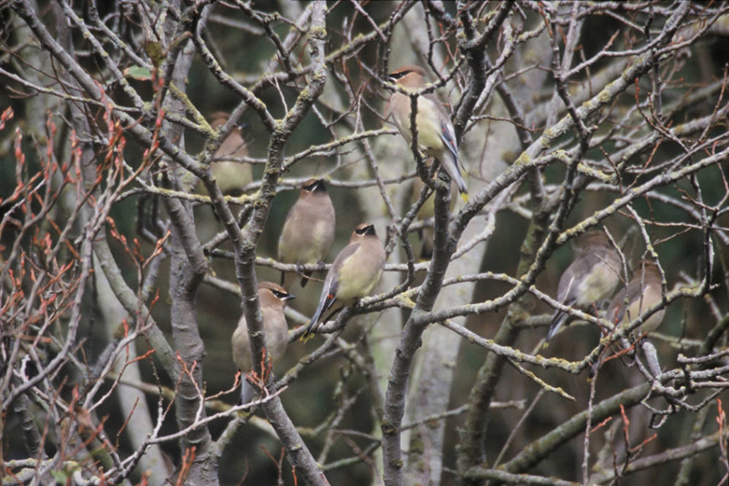 Cedar WaxwingCedar waxwings are very social birds. They are non-territorial and will often groom each other. They travel in flocks of 40 or more birds. They often will appear in a spot with a good crop of berries. When they have eaten all the berries, they move on!