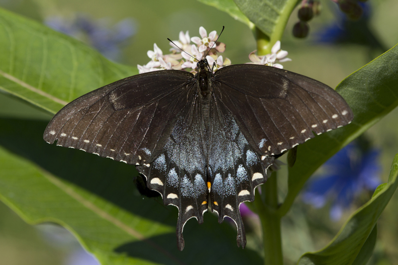 Females can range in color from the yellow of the male to an almost solid bluish-black. The black form the the eastern tiger swallowtail is most common in the southern part of its range in areas also inhabited by the pipevine swallowtail, a butterfly that has an unpleasant taste. The black form of the eastern tiger swallow tail may be an example of deceptive coloration using mimicry.