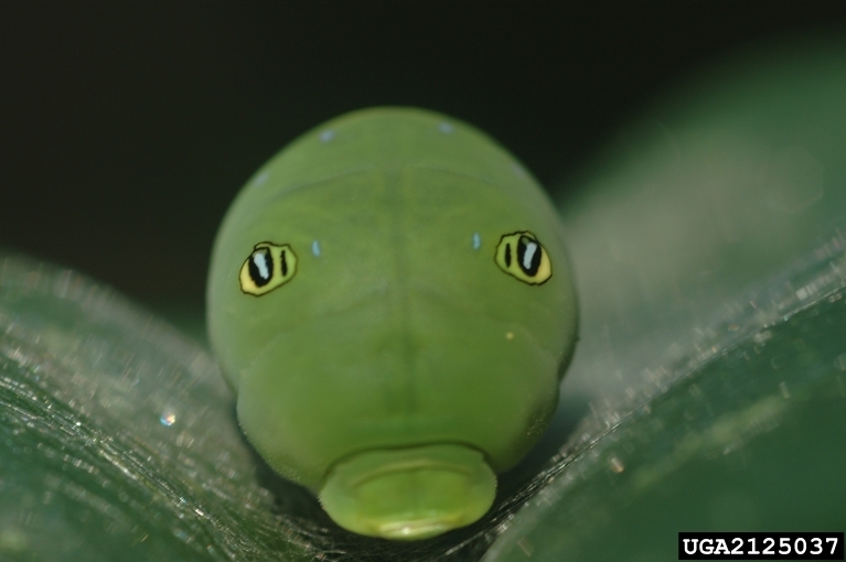 When the eastern tiger swallowtail caterpillar matures it is green with orange and black false eyespots. The eye spots are a type of deceptive coloration that helps protect the caterpillar from predators. Predators see the eye spots and think that the caterpillar is a much large animal than it really is!