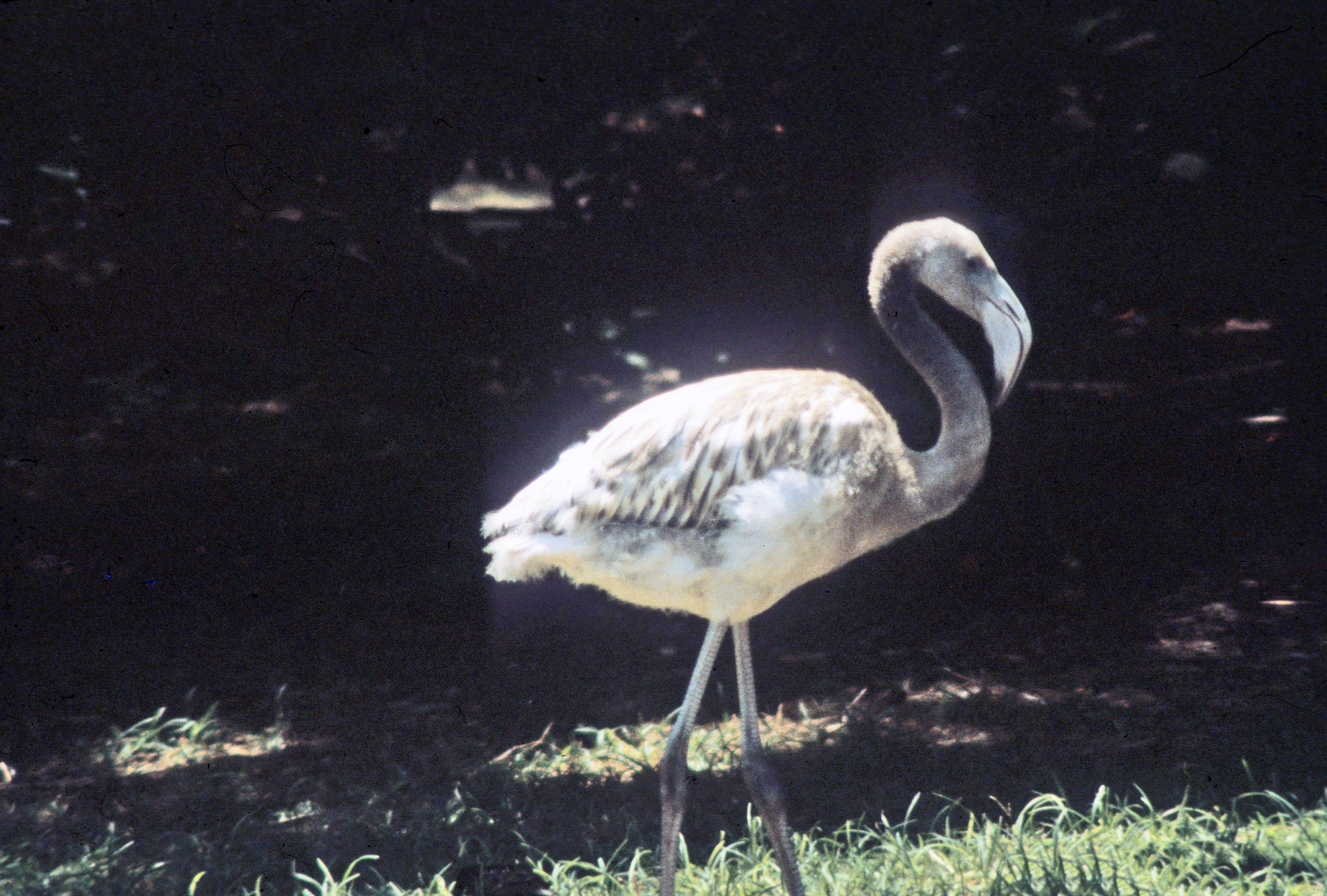 Chicks are downy gray and have a straight bill when they are born. Both parents feed the chicks. The chicks fledge in about 70-75 days. Chicks won't reach their full adult size for 1 ½ to 2 years and they won't have adult plumage for 2-4 years. Male and female pairs usually mate for life. The flamingo can live for up to 20 years in the wild.