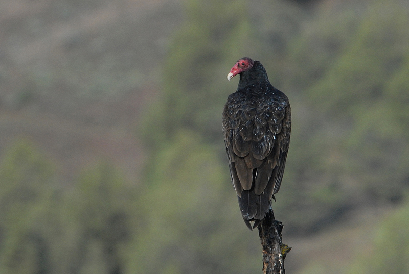 Turkey VultureThe turkey vultures is a scavenger. It only eats carrion. It soars over the land looking for dead animals. It has excellent eyesight and a keen sense of smell that helps it locate rotting meat. Because it doesn't hunt and kill it food its legs and claws are weaker that that of most birds. The turkey vulture has a bald head. This helps keep dead meat along with the bacteria it carries from collecting in the vulture's feathers while it is digging into an animal carcass. The turkey vulture also urinates on its legs. It's urine cools the vulture and the acids in the urine kill any bacteria that collected on the vulture's legs when it was stepping in the carcass.