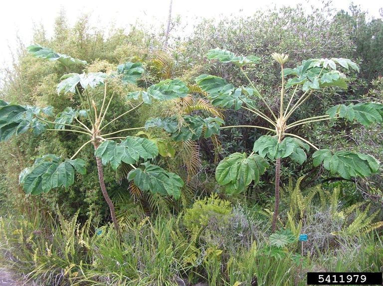 Trumpet TreeThere are 300 species of of trees, shrubs, and woody vines in this family. Male and female flowers are on separate plants. Species inthis family include the trumpet tree, which is native to Mexico and Central and South America. It was introduced to Hawaii in the 1920s.