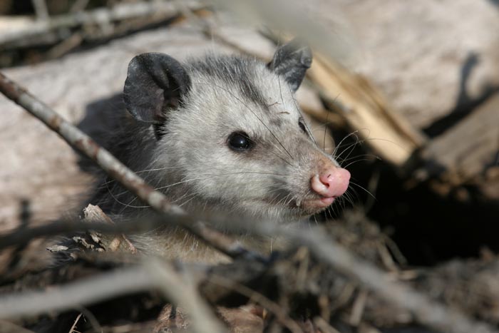 The opossum doesn't hibernate in the winter, but it often holes up during very cold weather because it runs the risk of getting frostbite on its hairless ears, tail, and toes.