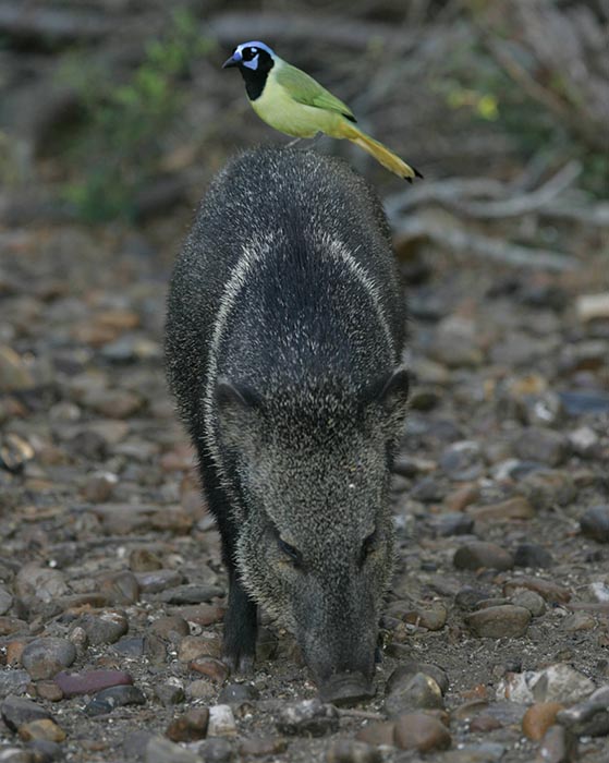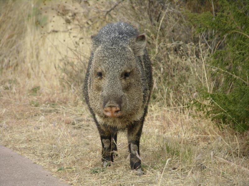 Collared PeccaryThe collared peccary has a pig-like snout, a large head and shoulders and small legs with hoofed feet. It has grizzled gray and brown bristly fur. It has a collar of white or yellowish fur around its neck and small, straight tusks. It is two to three feet long and stands about one and a half feet to two feet tall. It has a musk gland at the top of its rump. It uses its musk to identify members of its group and to mark its territory. It is sometimes called the javelina.