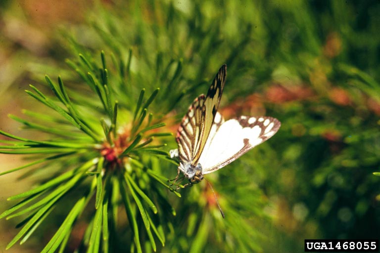The pine white butterfly is also known as the pine butterfly. It has a wing span of between 1 3/4 and 2 1/4 inches. Its forewings are white on the uppersides with heavy black marking on its wing tips and black edges. The undersides of its back wings have black veins. Males and females are similar, but the female is a little duller in color and her hindwings are sometimes edged in red and tinged with yellow.