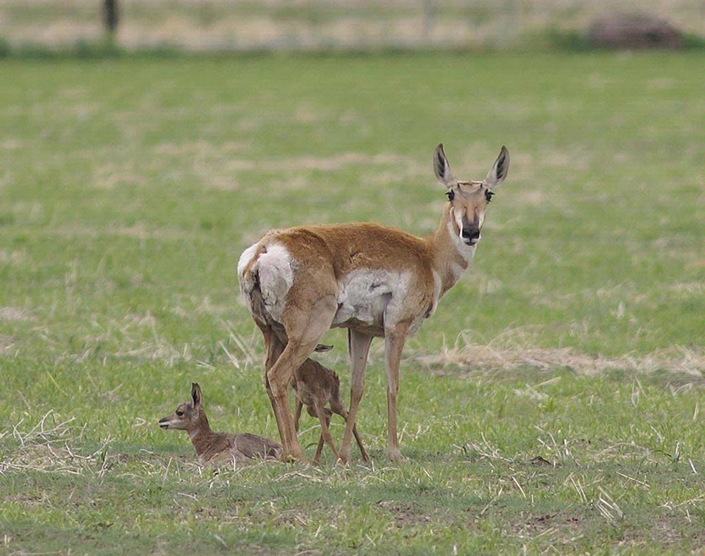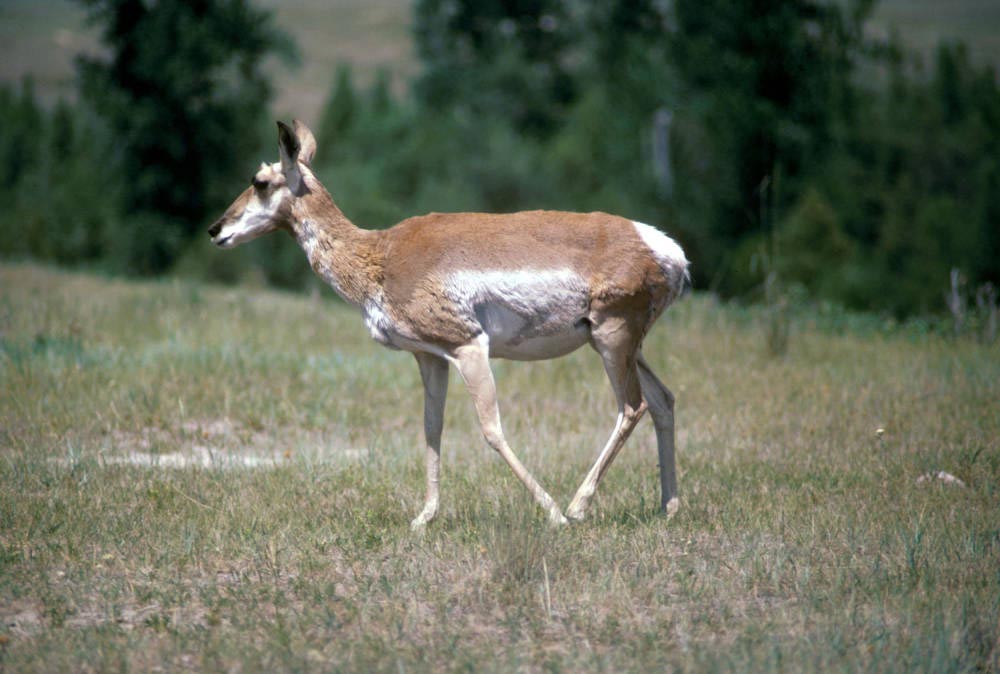 The female does not have the black markings and her horns are usually straight, short spikes between 3-4 inches long. The pronghorn has horns, not antlers. Its horns are made of two parts: a bony core that is covered by a sheath made of a stiff hair-like material. It is the only animal that has branched horns and it it the only animal that sheds its horns each year! The outer sheath falls of every year in the fall and then grows back in the summer!