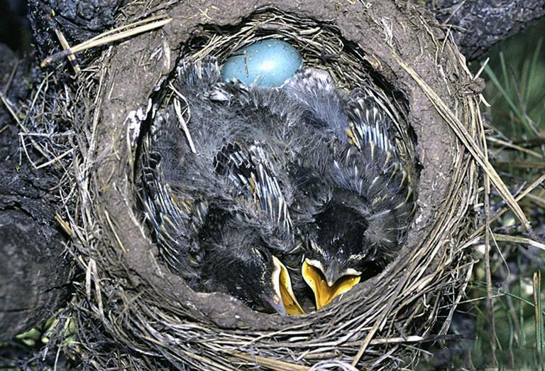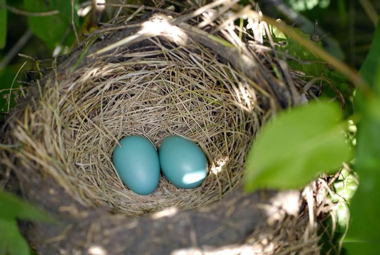 American RobinThe nest is built five to fifteen feet above the ground in a tree or bush. Sometimes a robin builds its nest on a window ledge. The female lays two to five light blue eggs. The female incubates the eggs for about two weeks. Once the chicks hatch, the male and the female feed and care for them. When they are about two weeks old, the chicks leave the nest for the first time. They will still beg for food from their parents as they nest under cover on the ground. They are able to fully fly about two weeks after leaving the nest. American robins live for about two to six years in the wild, although there is a record of one American robin in the wild that lived to be 14 years-old.