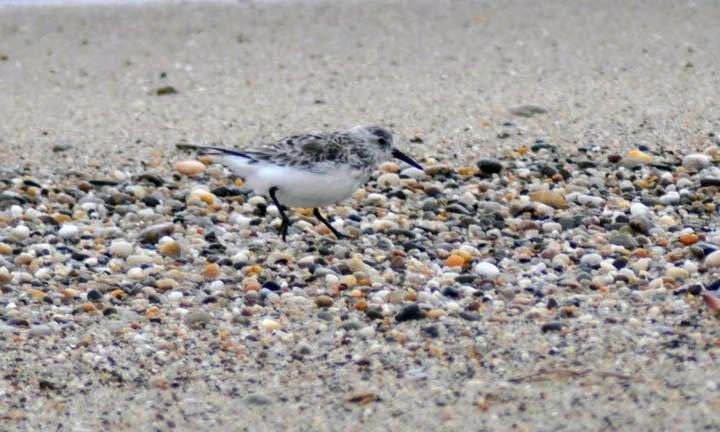 The sanderling is a medium-sized shore bird about 6 inches in length. It has speckled brownish-gray plumage on its uppersides, a dark, pointed bill, black legs and a white belly. In winter, the sanderling's plumage turns grayish-white.