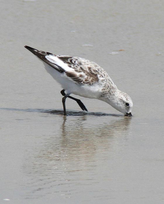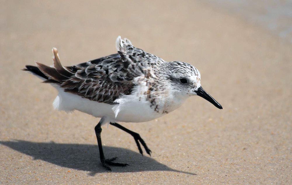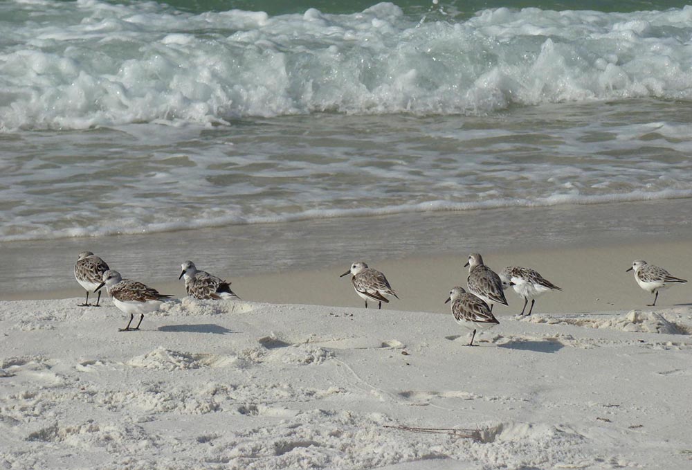 Small groups of sanderlings can often be seen on beaches scurrying after waves as they roll back out to sea. They are actually looking for tiny crustaceans and mollusks exposed by the retreating water.