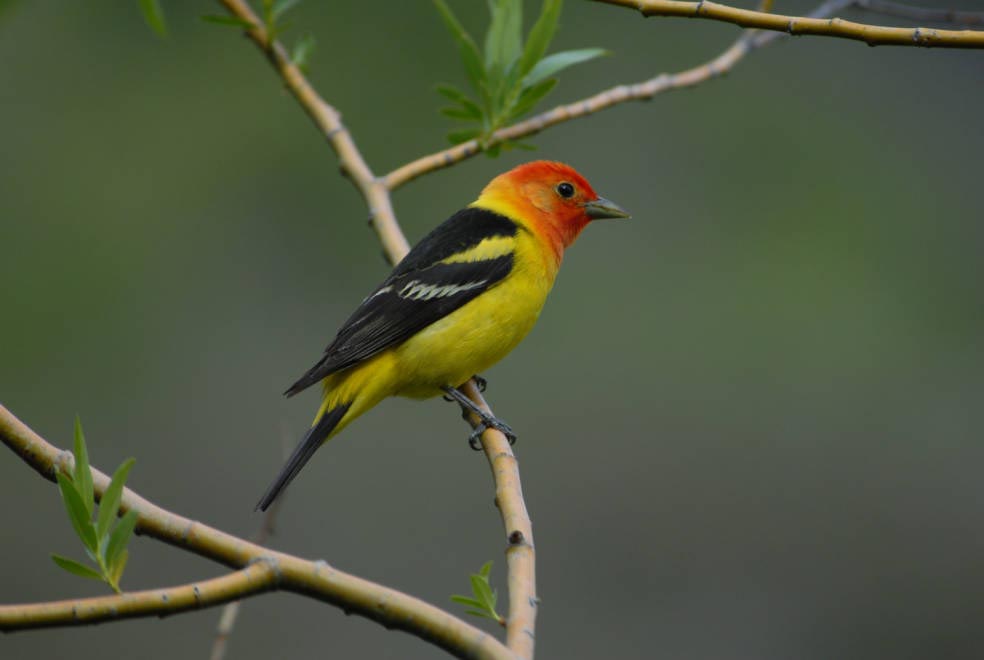 Western TanagerThe western tanager is 6-7 inches in length. The male western tanager has a bright red head, a bright yellow body and black wings. The female western tanager is greenish-yellow on top and yellow on her underside. Both the male and female have two wing bars. The top wing bar is yellow and the bottom one is white.