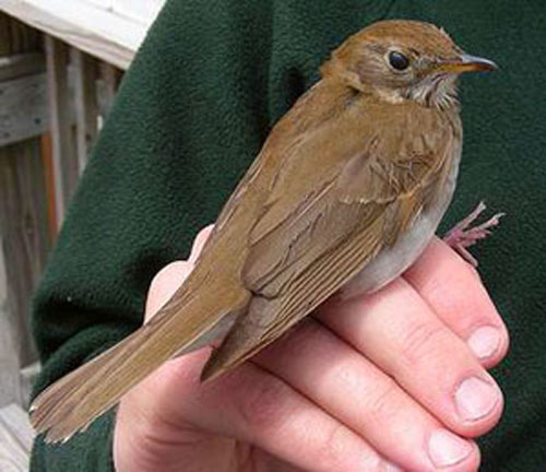 The Bicknell's thrush is difficult to see, but easy to hear. It likes to sing from the tops of dead trees that stand high above other trees and shrubs. It is a small bird at only 6-7.5 inches. The Bicknell's Thrush has an olive brown head, back and wings, whitish-gray belly with brown spots.