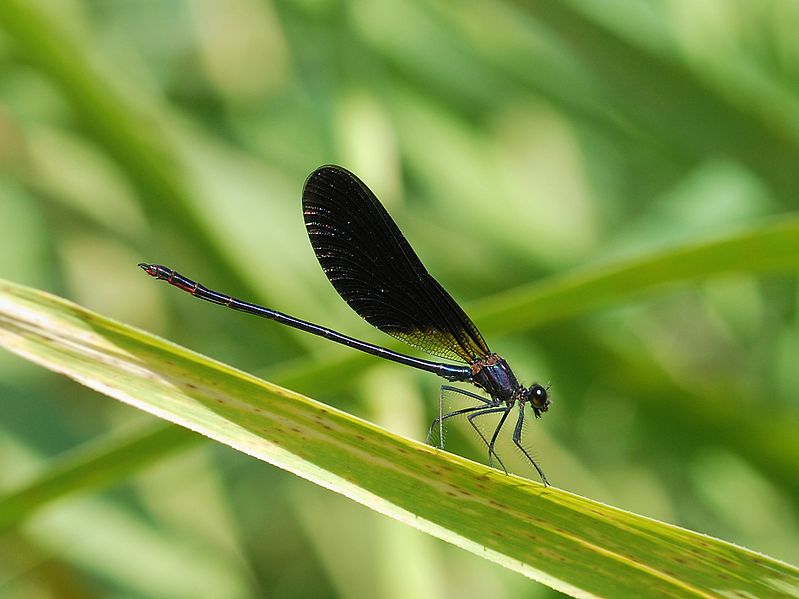 There are about 150 species in this family of damselflies. Nine species are found in North America. Broad-winged damselflies are 1.5 - 2.5 inches in length.They are usually metallic black or green in color. Broad-winged damselflies have broad wings; long antennae; and long, slender, stick-like abdomens.