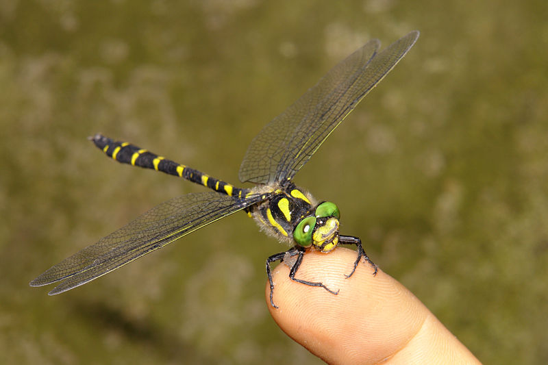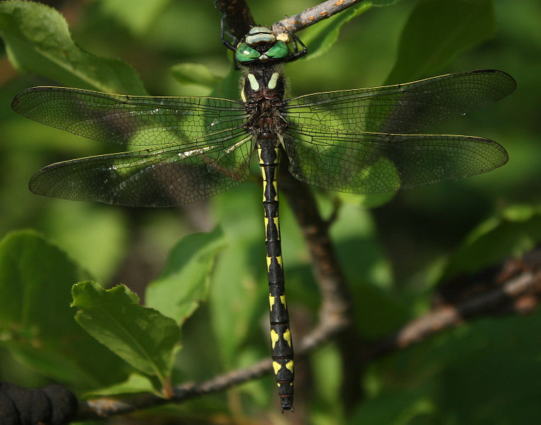 Spiketails have wide heads and clear to smoky black wings. They are brown or black with yellow markings. They have large green or blue eyes that meet on the top of their heads.