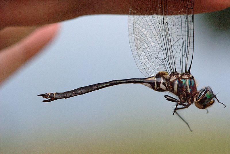 The dragonflies in this family are large, usually between 1.5 and 3 inches in length. They have bright green eyes, and many species are black with metallic green or yellow markings.