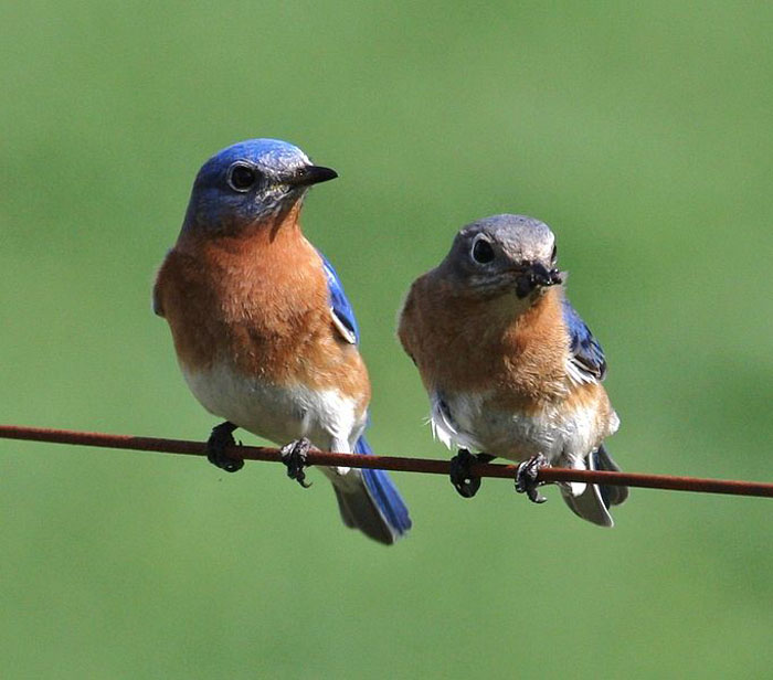 Breeding occurs in the spring and summer. The Eastern Bluebird builds its nest in a tree cavity or a man-made nest box. The female builds the nest by weaving together grasses and pine needles and lines the nest with fine grasses and soft, downy material. She may use this nest several times. The female lays 3-7 light blue eggs, which she incubates for 13-17 days. Young chicks leave the nest 15-20 days after hatching. Both the male and female feed the young insects. The Eastern Bluebird can live for 6-10 years.