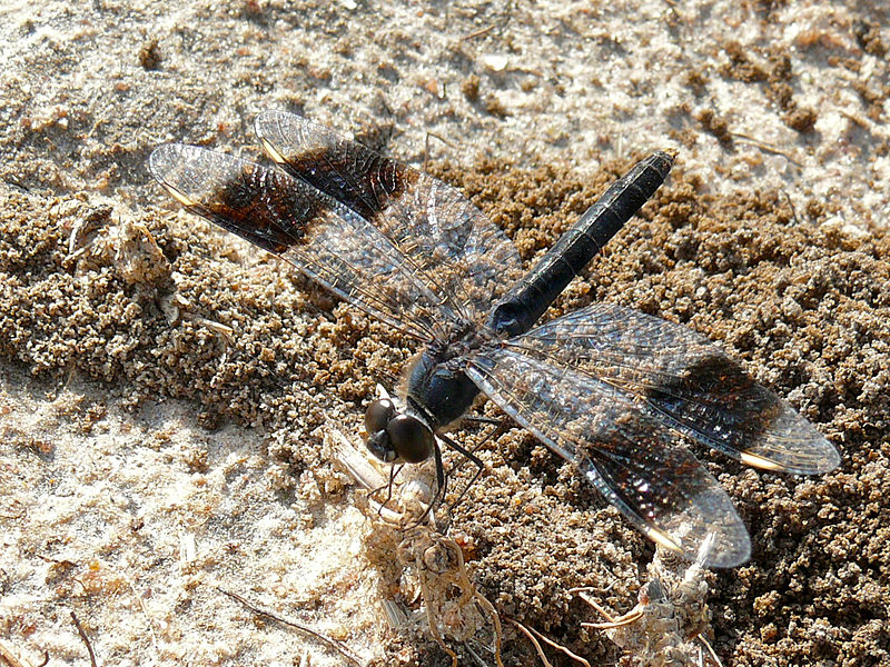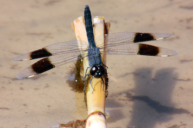 The band-winged meadowhawk is usually found at shallow marshy areas with slow currents.