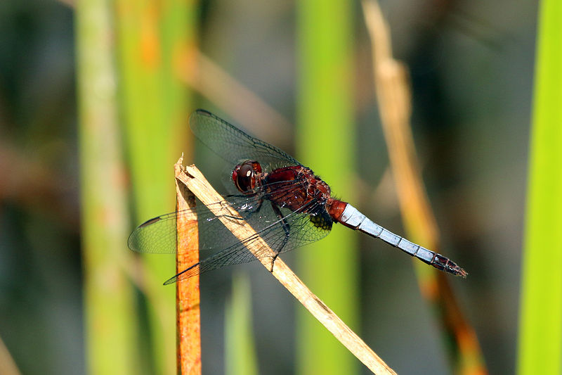 The male blue-faced meadowhawk is red with a blue to turquoise face.