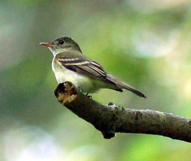 Acadian FlycatcherThe Acadian flycatcher is a small flycatcher. It is around 5 inches in length. It has greenish-brown upperparts, a grayish-white throat, a white lower breast, a light yellow belly, white wing bars, and a white rings around its eyes. Males and females look alike.