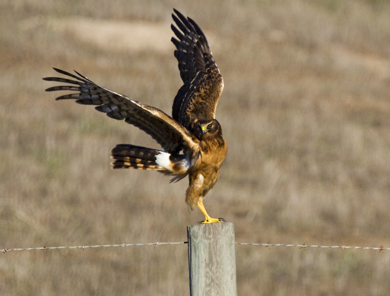 Swainson's hawk is often seen perched on a fence post in a prairie or open range.