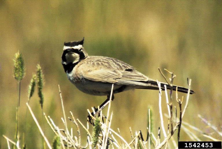 The horned lark is found throughout North America. It is also found in Asia and Europe. It lives in open areas like prairies, fields, and the tundra. The horned lark is about seven inches in length. It is brown on its uppersides and white on its belly. It has a black neck patch and a black mask on its face. It gets its name from the tufts of feathers on its head that look like horns.