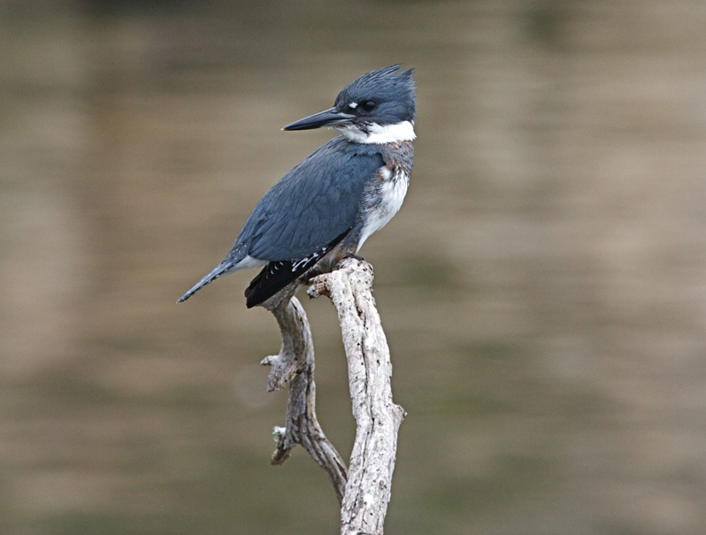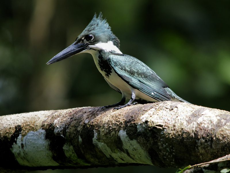 The ringed kingfisher searches for fih from a perch over shallow waer.