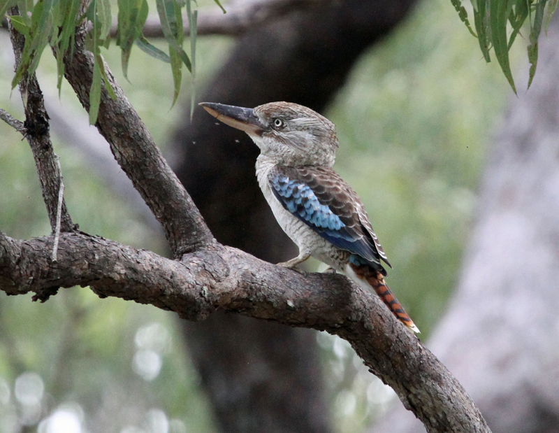 KookaburraThere are three other species of kookaburras. The blue-winged kookaburra is found in Australia and New Guinea. It is a little smaller than the laughing kookaburra and is brown with blue-edged wings. The rufous-bellied kookaburra is found in the rainforests of New Guinea. It has a white bill, a reddish belly and tail, and bluish wings. The spangled kookaburra is found on the Aru Islands and New Guinea. It has a white chest and belly, bright blue wings and tail, and a black head with white spots.
