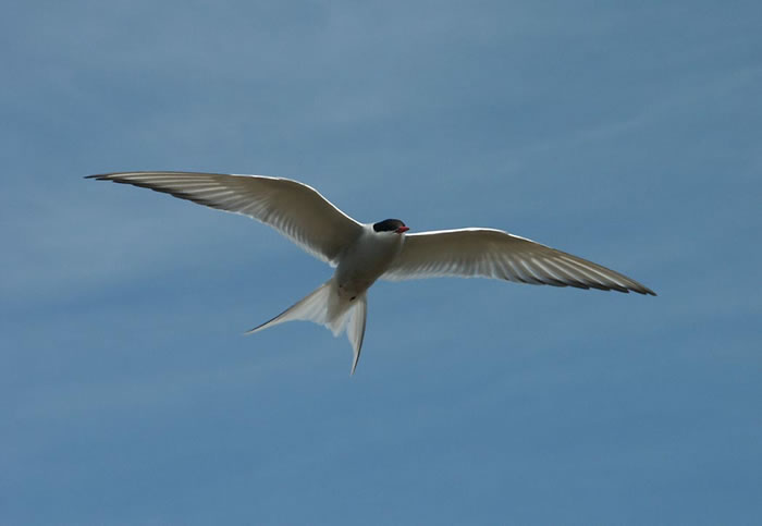 The Arctic tern is 14-17 inches in length and has a wingspan of 26-32 inches. It has a white throat, neck, and breast, soft gray upperparts and wings, and a black cap on its head. It has a long, pointed, forked tail and pointed wings edged with a dark line. It has very short legs, and it looks like it is crouching down when it stands. During breeding season, its bill, legs, and feet are a bright orange-red. Males and females look alike.