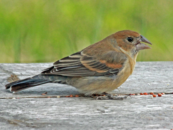 The male blue grosbeak reaches the breeding territory first. He perches on a branch and sings to attract a mate. Female blue grosbeaks usually have two broods a year with the same male. The female lays 3-5 light blue eggs in a cup-shaped nest made of sticks, bark, plant fibers, paper, and even string. It may also use snake skin in its nest! It is thought that the snake skin might scare away predators. The nest is made close to the ground in a shrub or a tree. The female incubates the eggs. Incubation takes about 11-12 days. The female does most of the feeding, but the male may take over after the chicks fledge and the female begins a new nest for her second brood. The chicks fledge when they are about 9-10 days old.