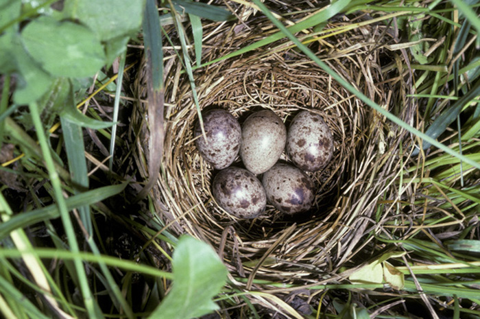 BobolinkThe Bobolink uses grass and sedges to build a nest on the ground. Sometimes, it crafts a canopy out of dead grass over the top of the nest for additional camouflage. The female lays 1-7 bluish-gray eggs, which she incubates for 11-13 days. After hatching, the chicks wait about two weeks before first leaving the nest.