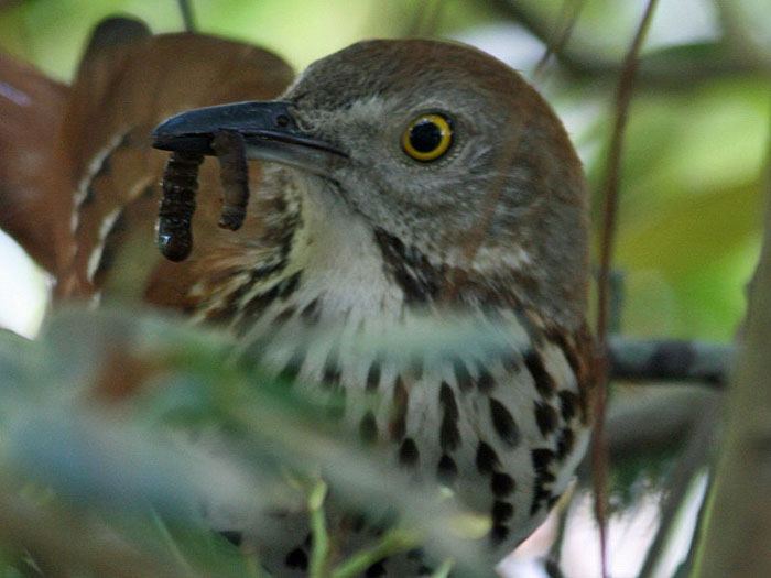 Eating insects, fruit, seeds and nuts, the Brown Thrasher is an omnivore. It feeds mostly on the ground, sweeping its bill along the ground to gather insects. The Brown Thrasher eats fruit right off the berry bush and gathers seeds directly from the plant. It eats a variety of insects, including beetles, cutworms, tent caterpillars, spongy moth caterpillars, leafhoppers, crickets, wasps and bees.