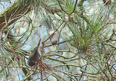 During the breeding season, bushtits form pairs and establish nesting territories. Their nests are up to a foot long and are pendulum-shaped. The nests have an opening in the top and hang from the branches of a tree or shrub. The nests are made of grass, twigs, leaves, moss, lichen, and various plant parts woven together with spider webs. The female lays 4-10 eggs, and both the parents incubate the eggs for 12-13 days. Both parents care for and feed the chicks. The chicks fledge when they are about 18 days old.