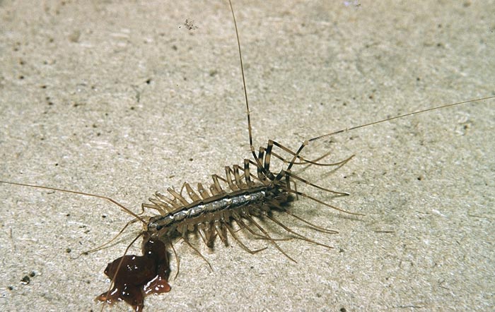 house centipedeOne species, the house centipede, is found in damp places in houses. It is about 1.5 inches in length and eats small insects like cockroaches, flies, and moths. It has long, feathery legs and very long antennae. The house centipede is native to Mexico, but is now found throughout the United States.