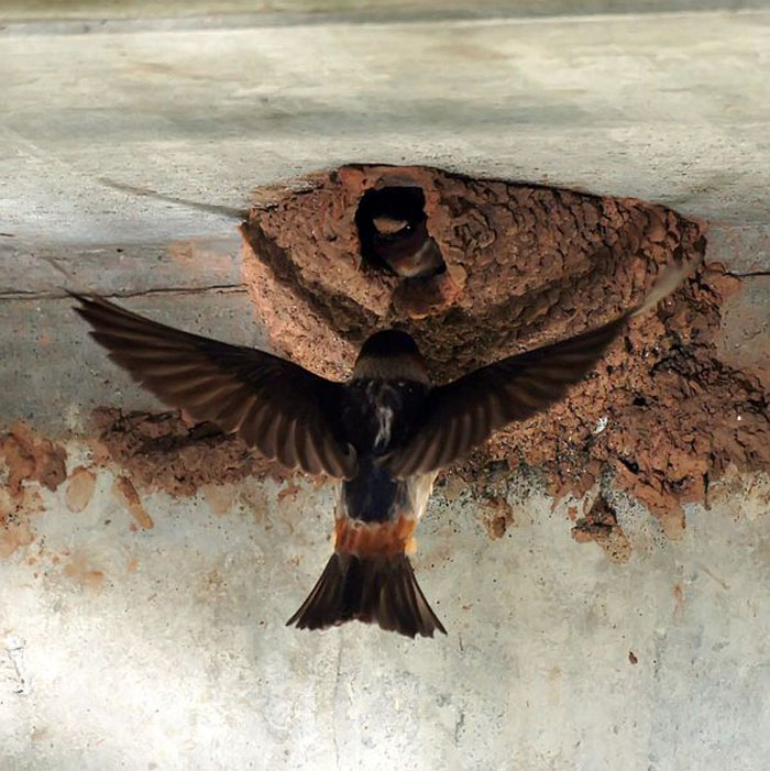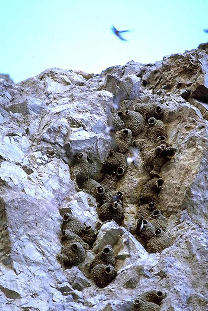 The Cliff Swallow builds a bowl-shaped nest with mud. It has a small tunnel on one side and the inside is lined with grass. The nest is built on a vertical wall or cliff, usually under an overhang. Cliff Swallows nest in colonies that range in size. In the west, colonies have grown to 3,700 nests in one spot!