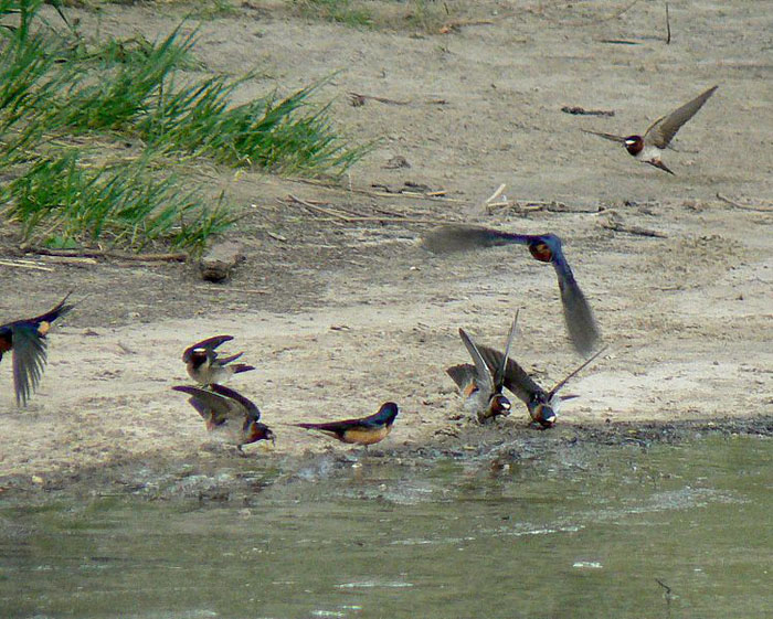 When a cliff swallow is having difficulty finding food, it will follow another to a good feeding spot. Once it finds food away from the colony, it may give a specific call to alert others. |