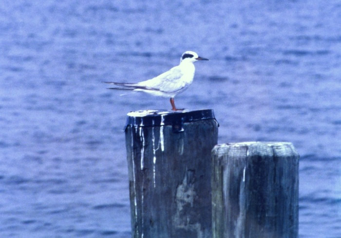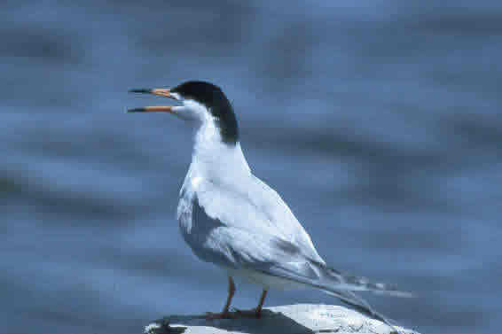 Forster's TernForster's tern is a medium-sized and slender tern. It is 13-15 inches in length with a wingspan of 30-31 inches. It has white undersides and a white throat and breast, a light gray back, and white-tipped gray wings. It has a black cap on its head, a deeply forked gray tail, orange legs and feet, and a long orange bill with a black tip. In the winter, it loses the black cap on its head and its bill turns black. It also develops black patches on its eyes and on the side of its head. Males and females look alike.