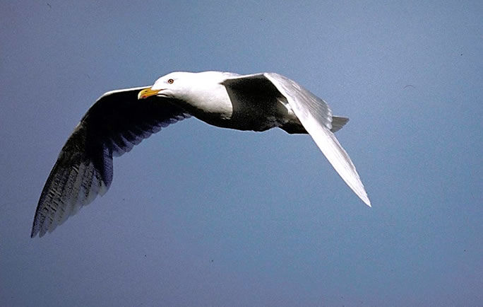 The glaucous gull is a predator and a scavenger. It hunts for bird eggs and chicks in nesting areas, and it steals food from other birds. It is also a common visitor to garbage dumps, harbors, fish-processing plants, and sewage ponds.
