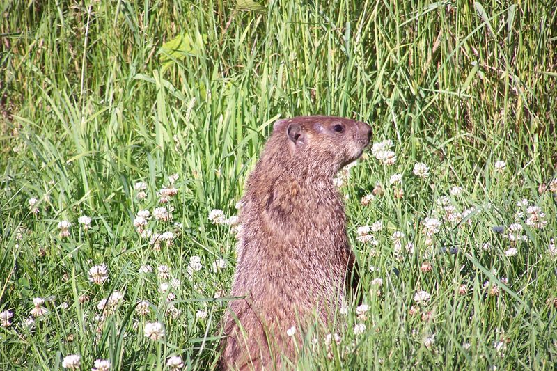 When the woodchuck is eating, it often looks up to check for predators. Its burrow is usually very close to where it feeds, so it can scurry back to safety if it spots a predator. When it is outside but not feeding, it will stand on its hinds legs and keep a lookout for predators.