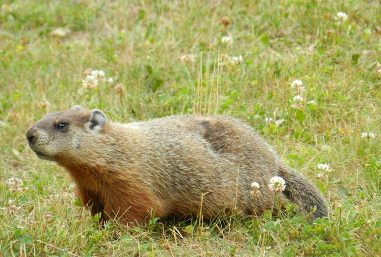 woodchuckThe woodchuck is a large ground squirrel. It is 16-27 inches from the tip of its nose to the end of its tail. It has gray to brownish red fur with white tipped guard hairs that give the woodchuck a grizzled look.
