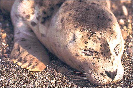 The male harbor seal is about 5-6 feet in length and weighs 200-375 pounds. The female is 4.5-5 feet in length and weighs 110-330 pounds. The harbor seal can vary in color from white, light gray, or yellowish gray with dark spots to black, gray, or brown with light rings or spots. Its fur is