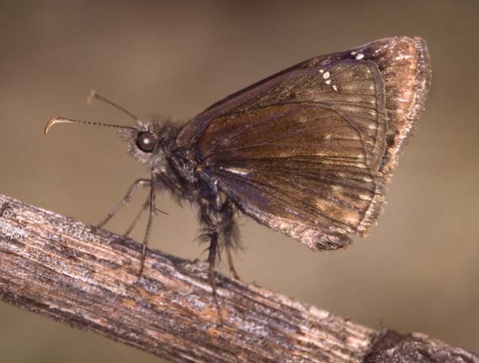 Horace's duskywing is a large skipper with a wingspan of 1.5 to 2 inches. It has brown-fringed wings. The male has dark brown forewings with small white spots. The female has lighter, mottled brown forewings with larger white spots. The male has
