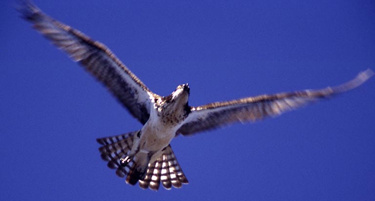 The osprey hovers about 100 feet over the water and uses its excellent eyesight to spot fish. When it locates a fish, it dives feet-first with its talons outstretched straight into the water and grabs its prey. It takes off from the water and adjusts the fish in its talons so the fish is facing head first. This makes the fish more