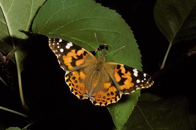 The painted lady has a wingspan of 2-3 inches. It has scalloped orange wings with black patches. The tips of its forewings are black with white splotches. Its underside is a mottled gray, brown, and black with four eyespots. The painted lady is also called