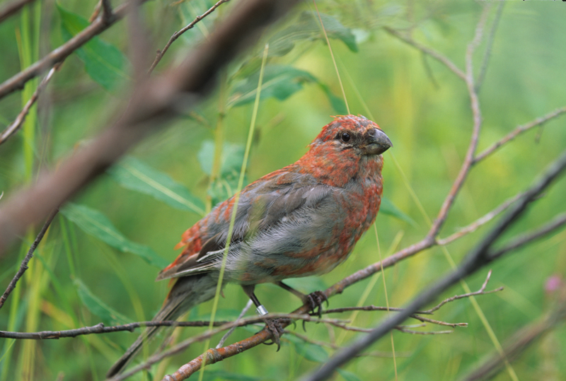 The female pine grosbeak lays 3-4 eggs in a twig nest lined with lichen, moss, and grass. The nest is built close to the ground. The female incubates the eggs for 13-14 days. The male brings the female food while she is incubating the eggs. Both the male and the female feed the chicks. The chicks fledge when they are about two weeks old, but they may still be fed by their parents after they fledge.