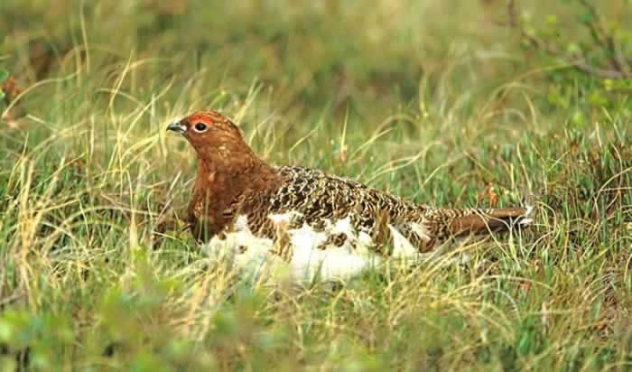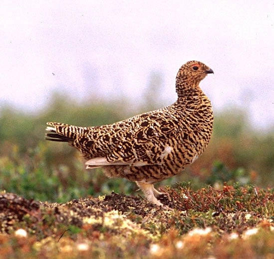 The rock ptarmigan lives on upland tundras. In the winter it may move to forest edges and thickets. |