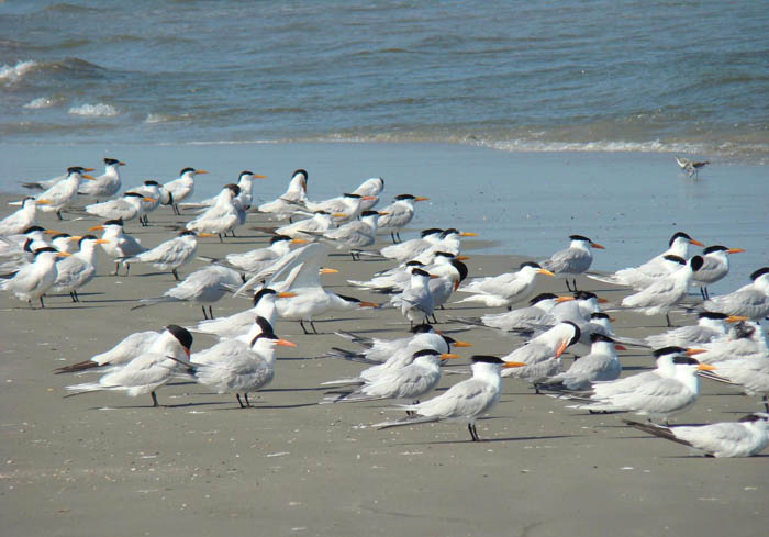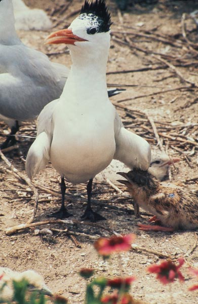 The royal tern nests in large, dense colonies. The female usually lays just one egg in an unlined scrape on the ground. Both the male and the female incubate the egg for 30-31 days. Shortly after hatching, the chick joins
